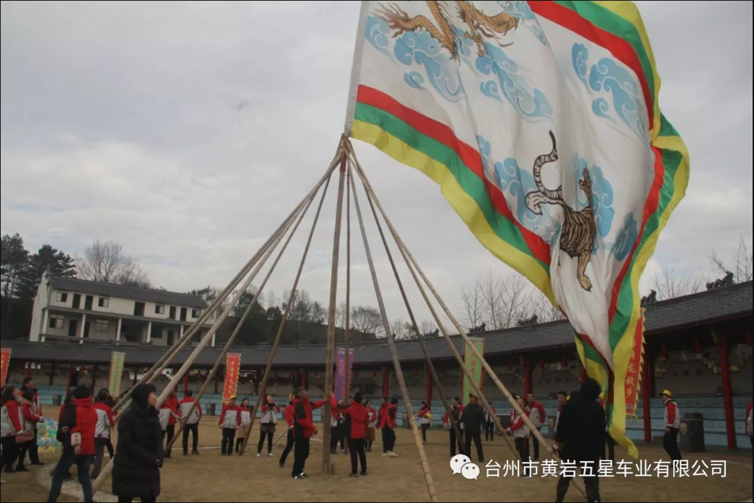 在“群山之祖,諸水之源”的磐安,至今流傳一項氣勢磅礴、驚心動魄的民間文藝習俗——迎龍虎大旗,而此時五星的家人們也在一聲號令中,眾人一齊用力,同心同德,大旗緩緩豎起也豎起來這面龍虎大旗。 大家圍繞大旗走圈祈福